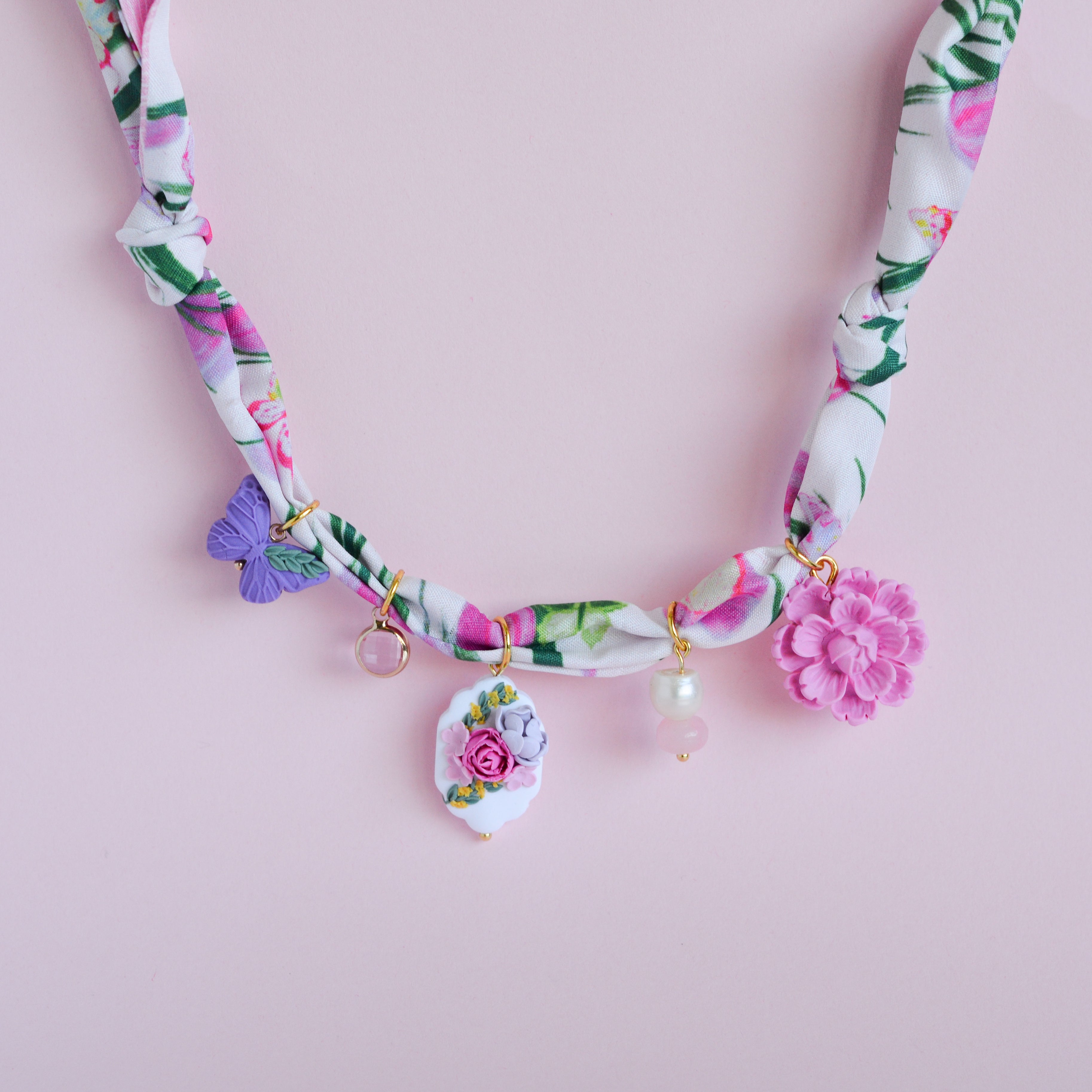 Say hello to your new favourite summer accessory. A Silk scarf with a gorgeous tulip and butterfly print, adorned with handmade polymerclay charms to compliment the fabric.